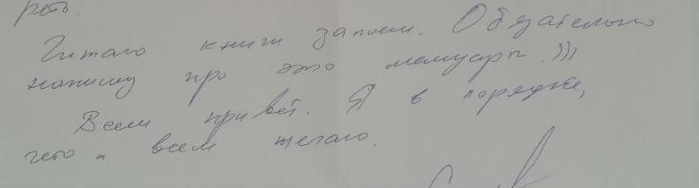 «Читаю книги запоем. Обязательно напишу про это мемуары. Всем привет. Я в порядке, чего и всем желаю», — говорится в письме Сергея Петрухина.