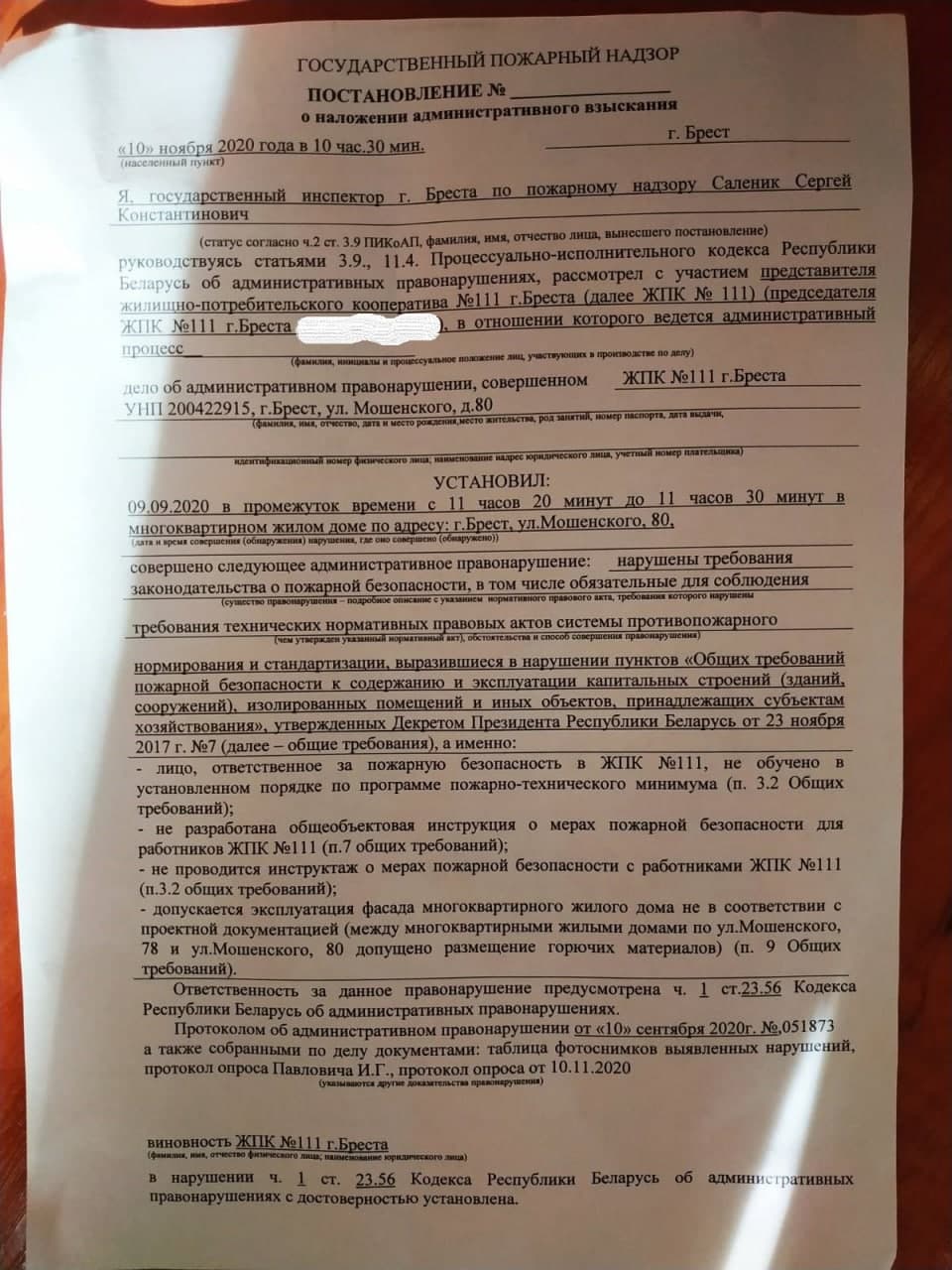 Согласно постановлению о наложении административного взыскания от 10 сентября (на следующий день после вывешивания флага – прим. ред.), в многоквартирном доме №80 нарушены требования законодательства о пожарной безопасности: лицо, ответственное за такую безопасность в ЖПК, не обучено в установленном порядке по программе пожарно-технического минимума, не разработана общеобъектовая инструкция о мерах пожарной безопасности работников кооператива и с ними не проводится инструктаж о мерах пожарной безопасности. Эти действия, по заключению инспектора пожарного надзора Антона Левлюха, подпадают под статью 23.56 «Нарушение законодательства о пожарной безопасности». Она влечет предупреждение или наложение штрафа в размере до 30 базовых величин, а на юридическое лицо – предупреждение или наложение штрафа в размере до 200 базовых величин.