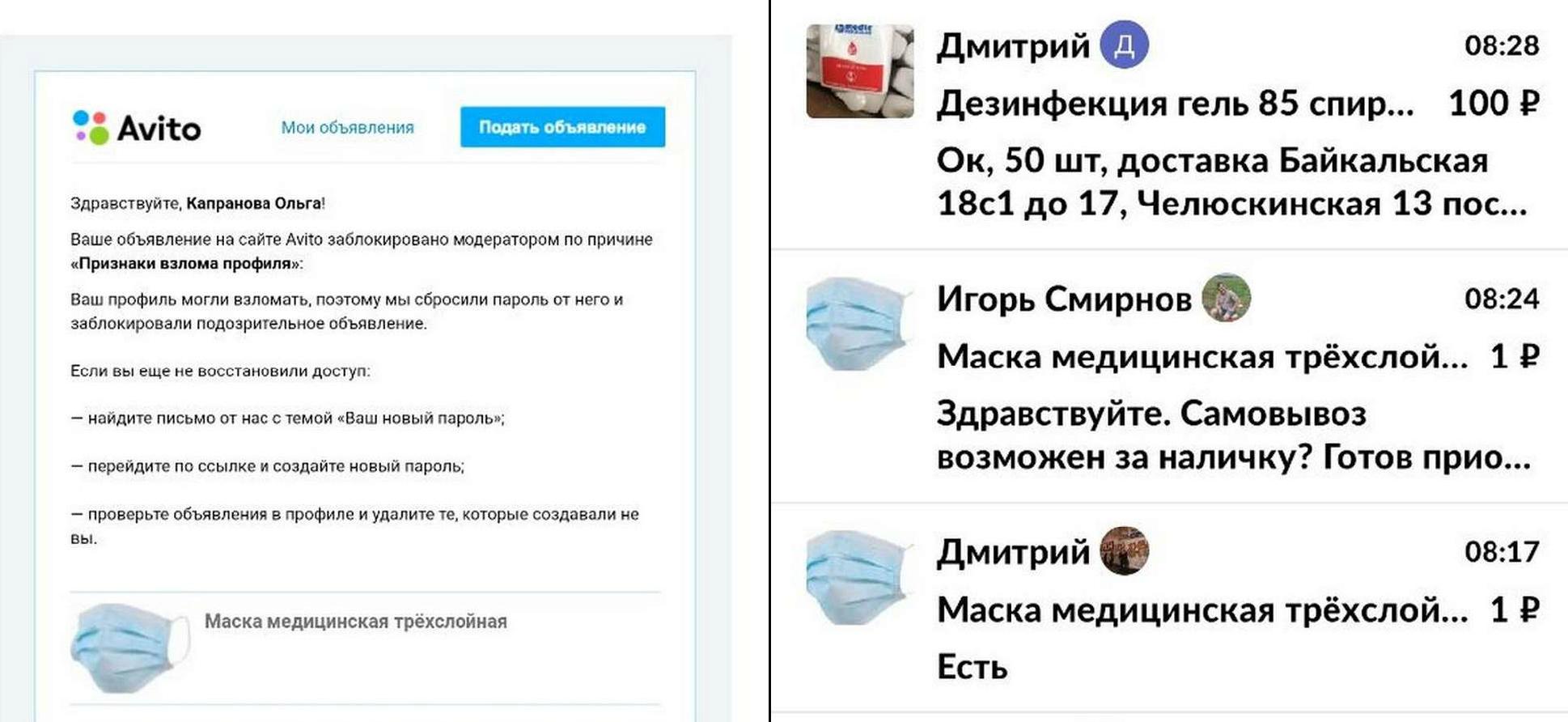 Тем не менее, уверяет Ольга, в московских аптеках защитных масок нет. И это при том, что в городе с таковыми редко можно кого-то встретить. Как и в Беларуси, на фоне распространения коронавируса вокруг них сложился ажиотаж. Дошло до того, что взломали аккаунт женщины на торговой онлайн-площадке и от ее имени торговали средствами защиты – масками и антисептиками.