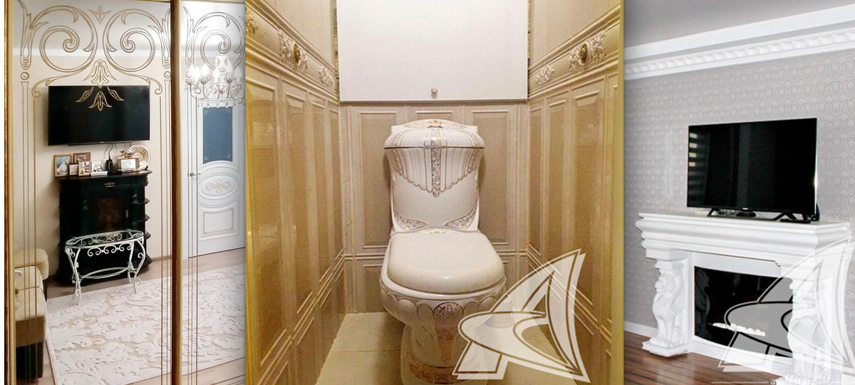 С первого взгляда квартиры можно перепутать: очень похожая входная дверь и коридор. Все белое и с вензелями. Но пройдя внутрь становится понятно, что здесь серьезно поработали над деталями. Мебель из массива и шпона «выбеленного» дерева украшена рисунком и резьбой, шторы в зелено-золотых тонах, узоры на ковре и зеркалах повторяются, под потолком изящные люстры. В этом изысканном антураже не хватает только Марии Антуанетты.